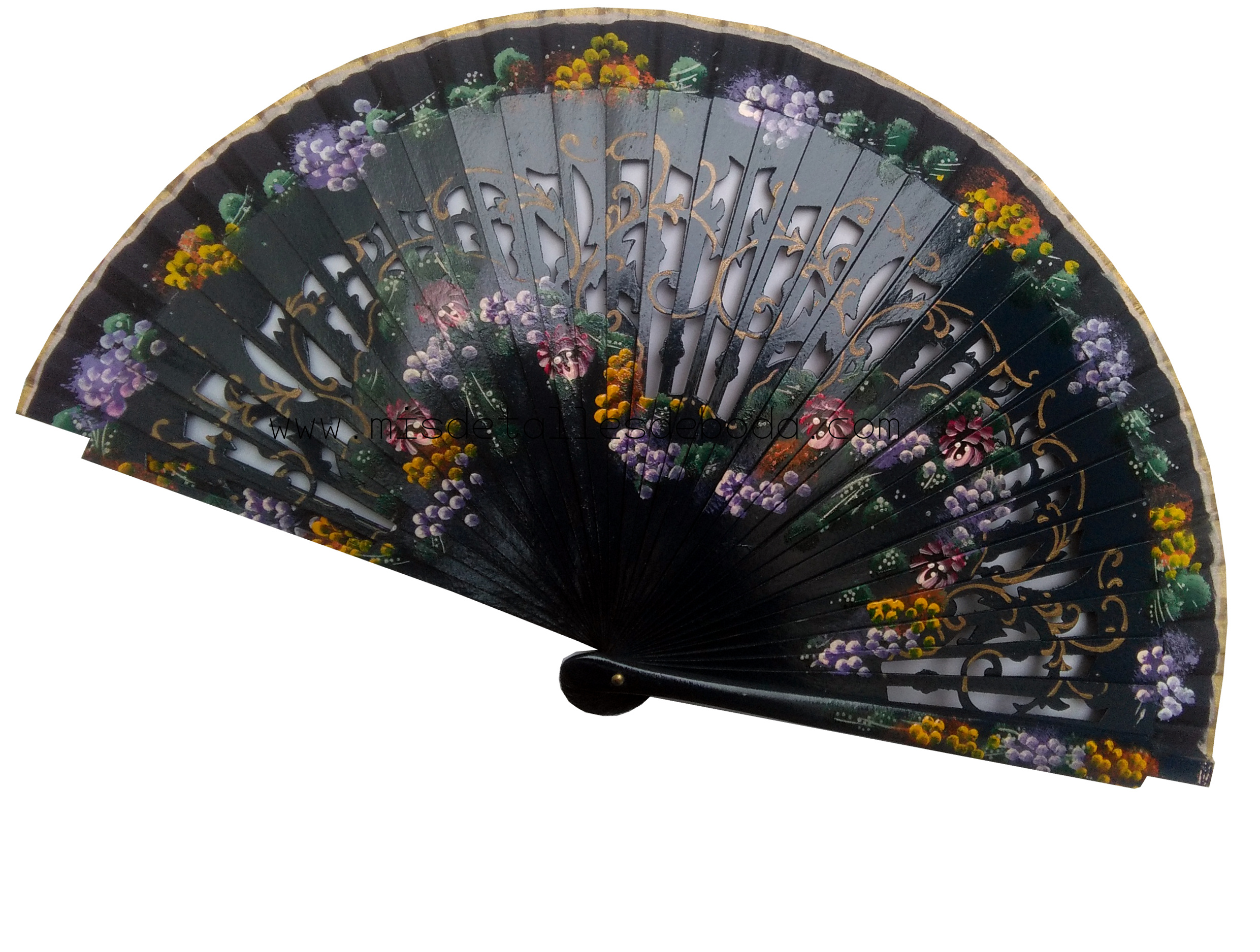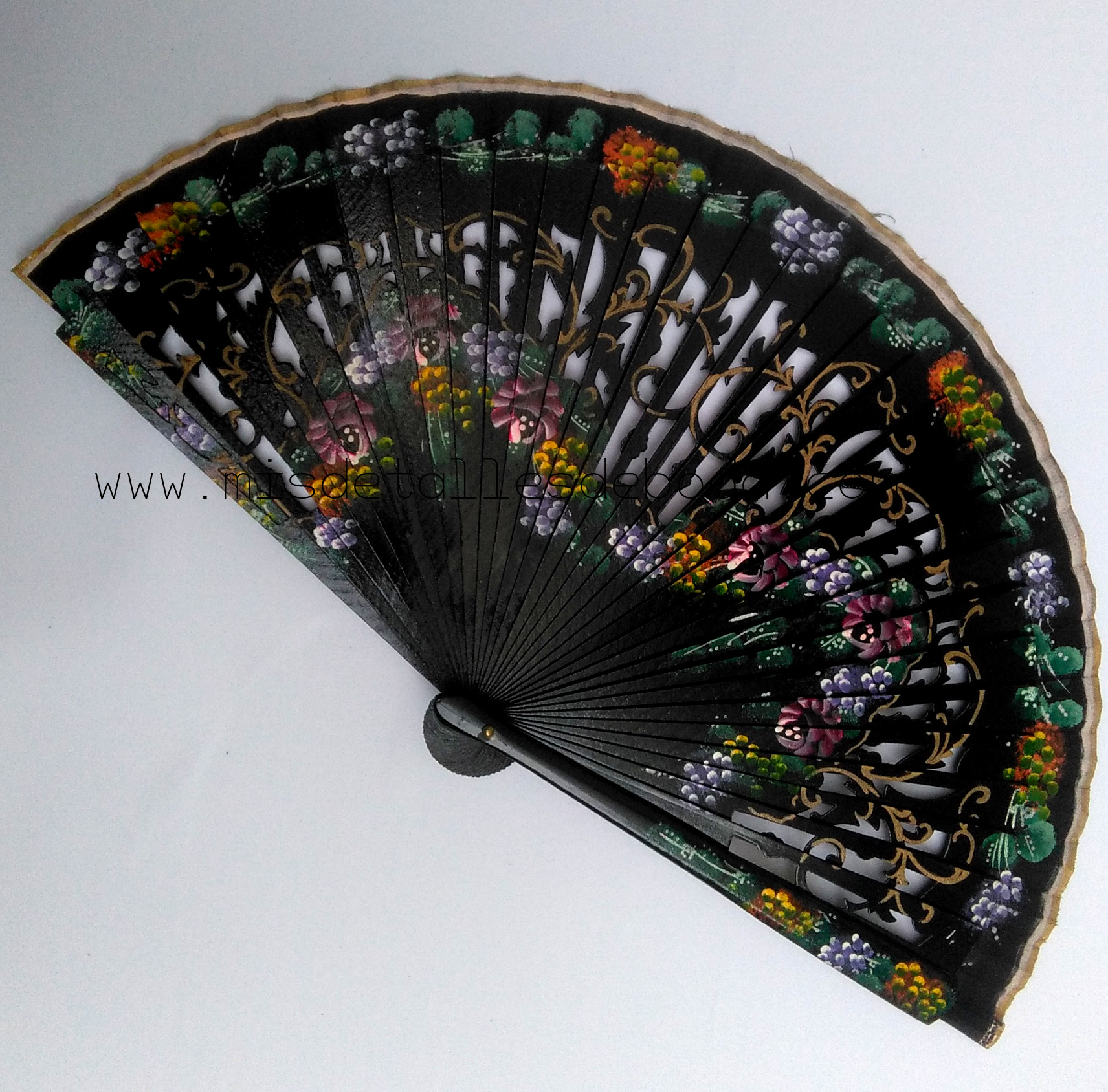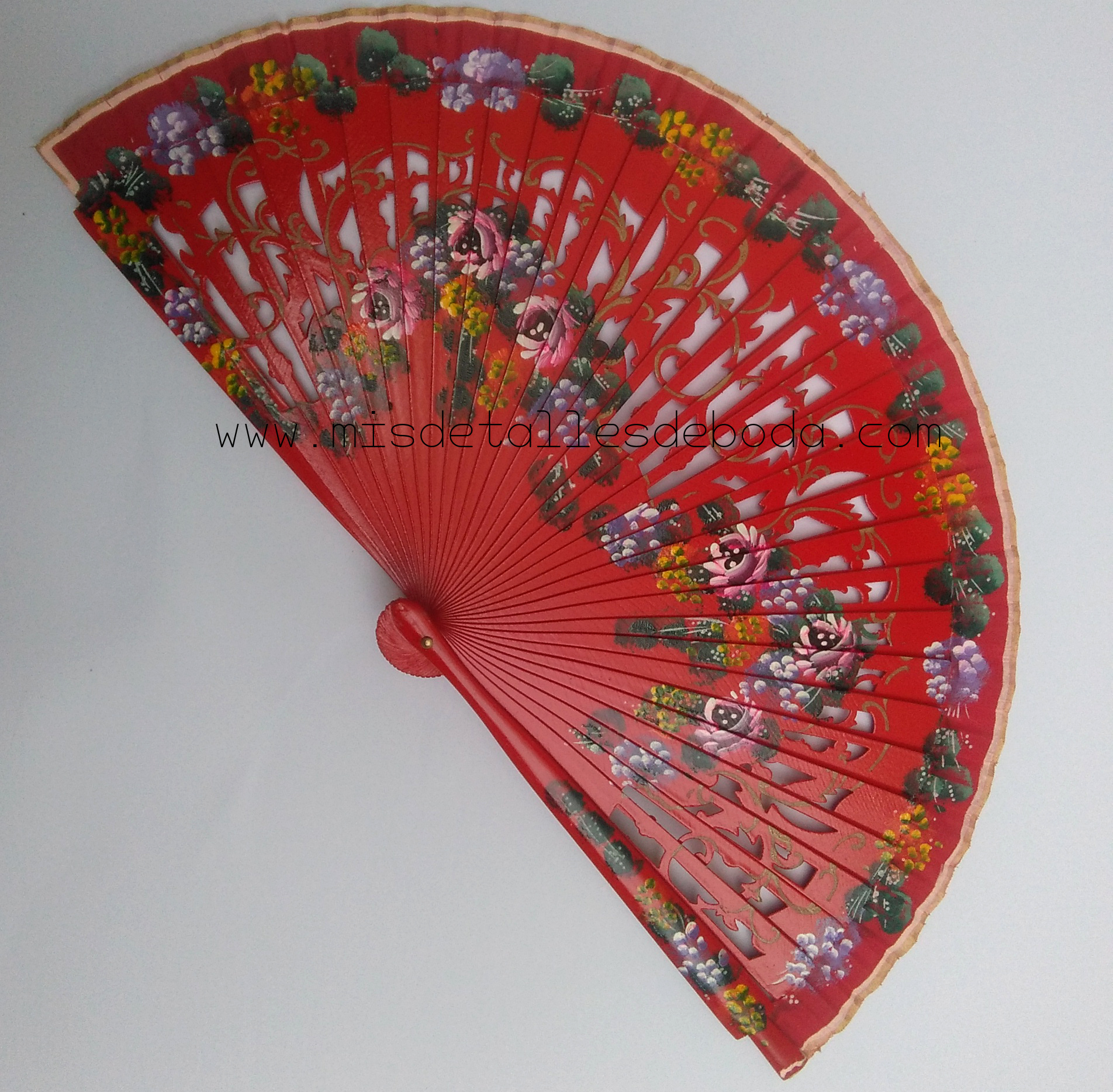 Abanico de madera y tela 23cm pintado a mano con flores por los dos lados.