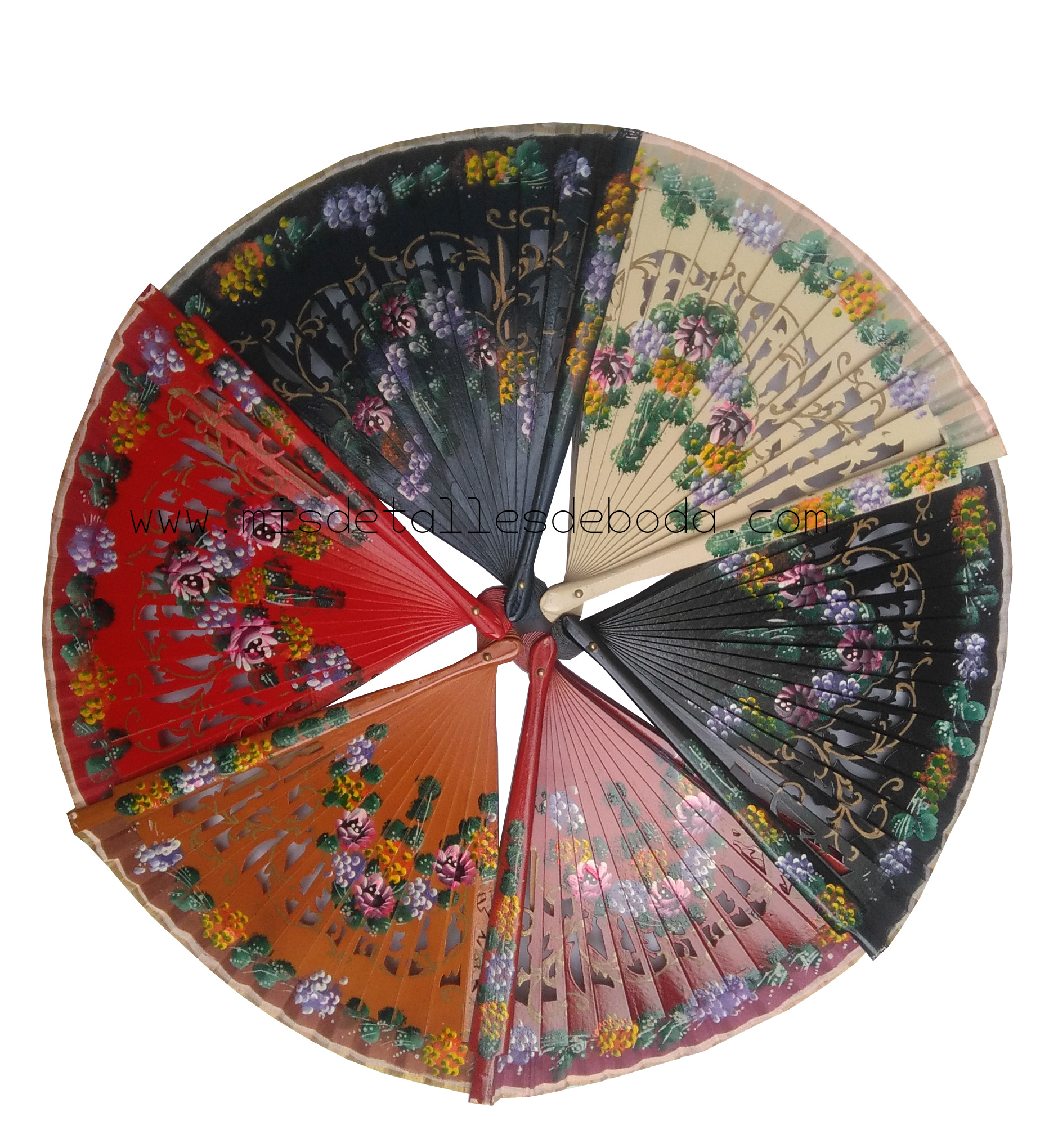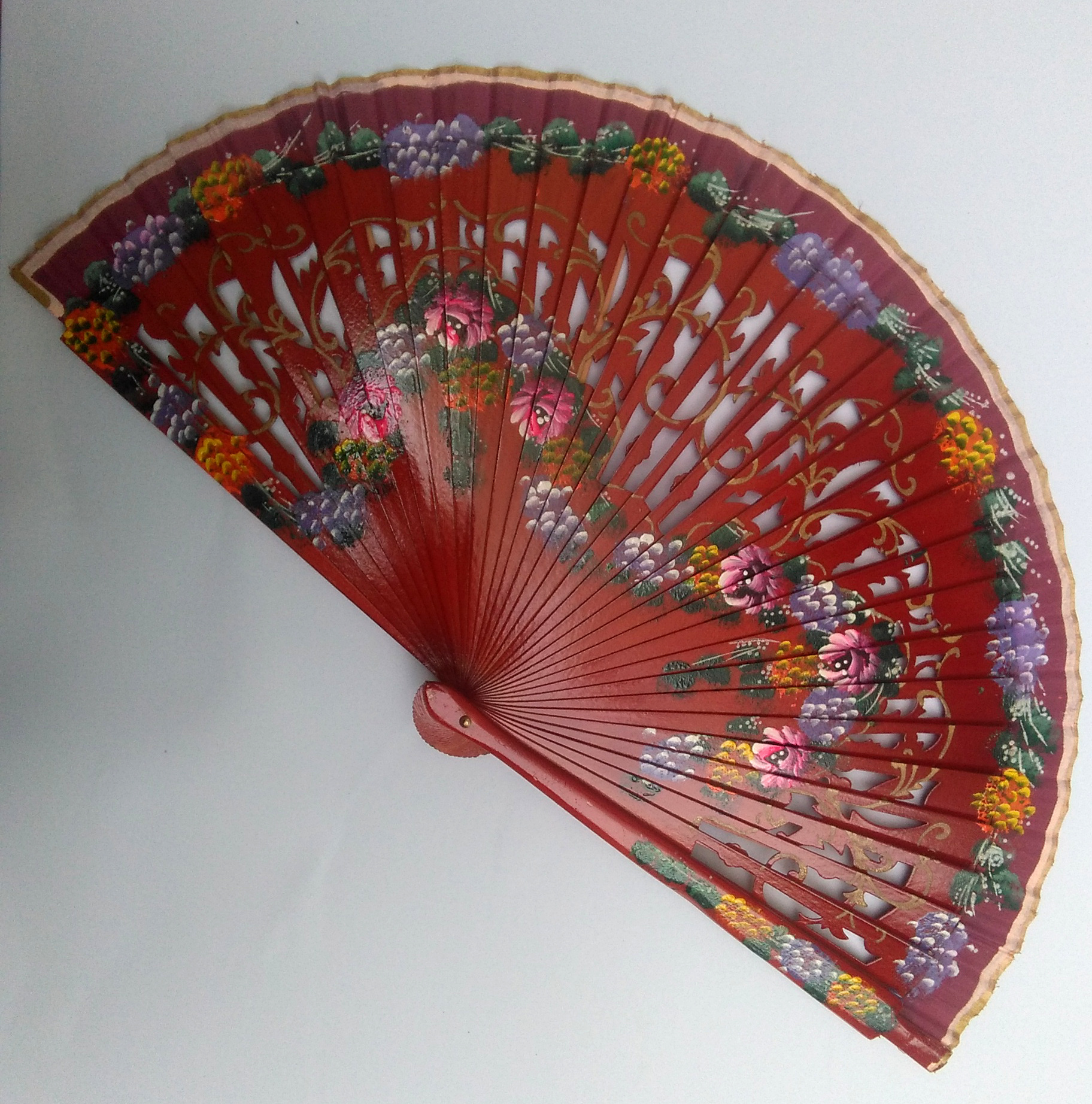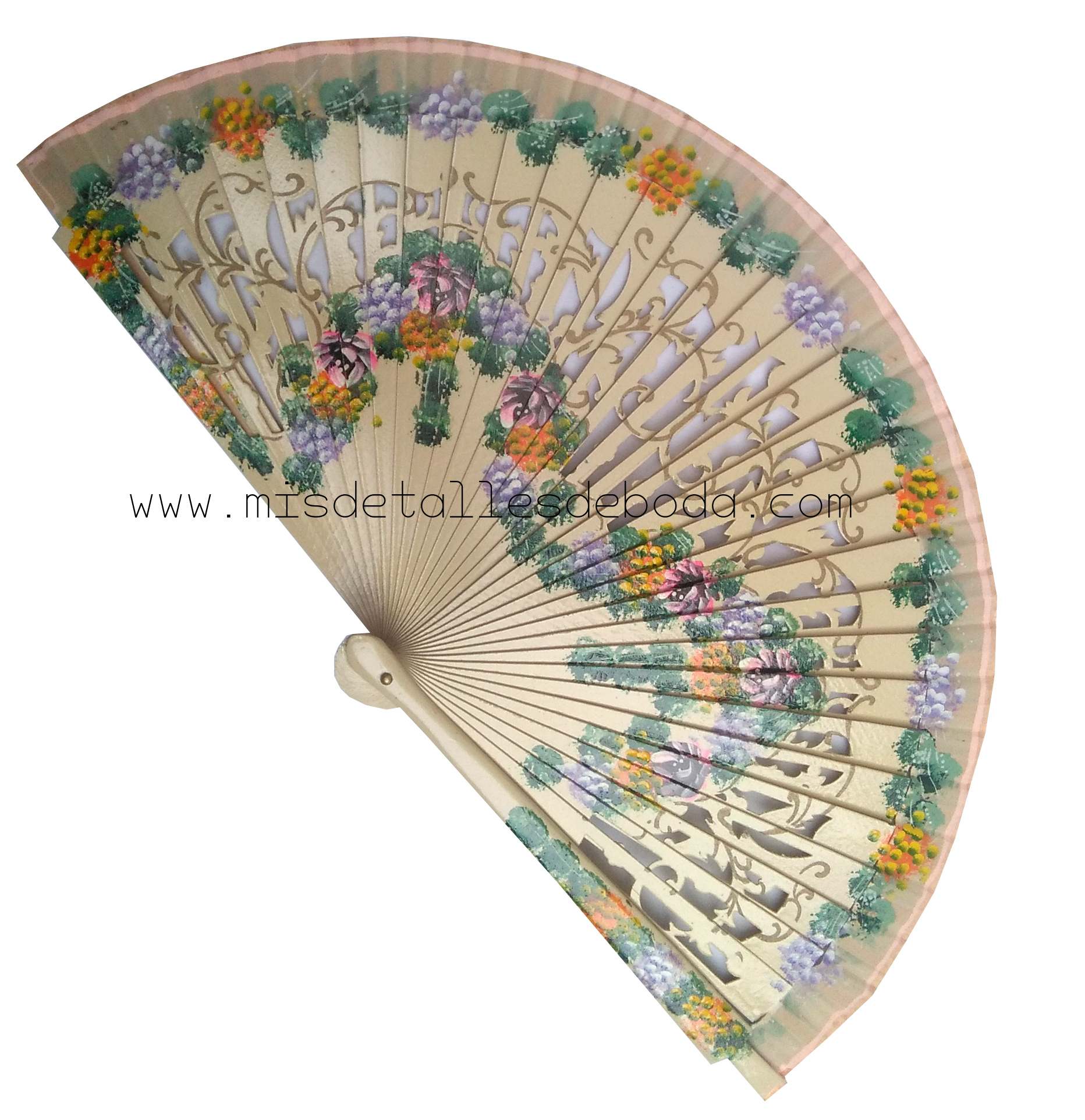 Abanico de madera y tela 23cm pintado a mano con flores por los dos lados.