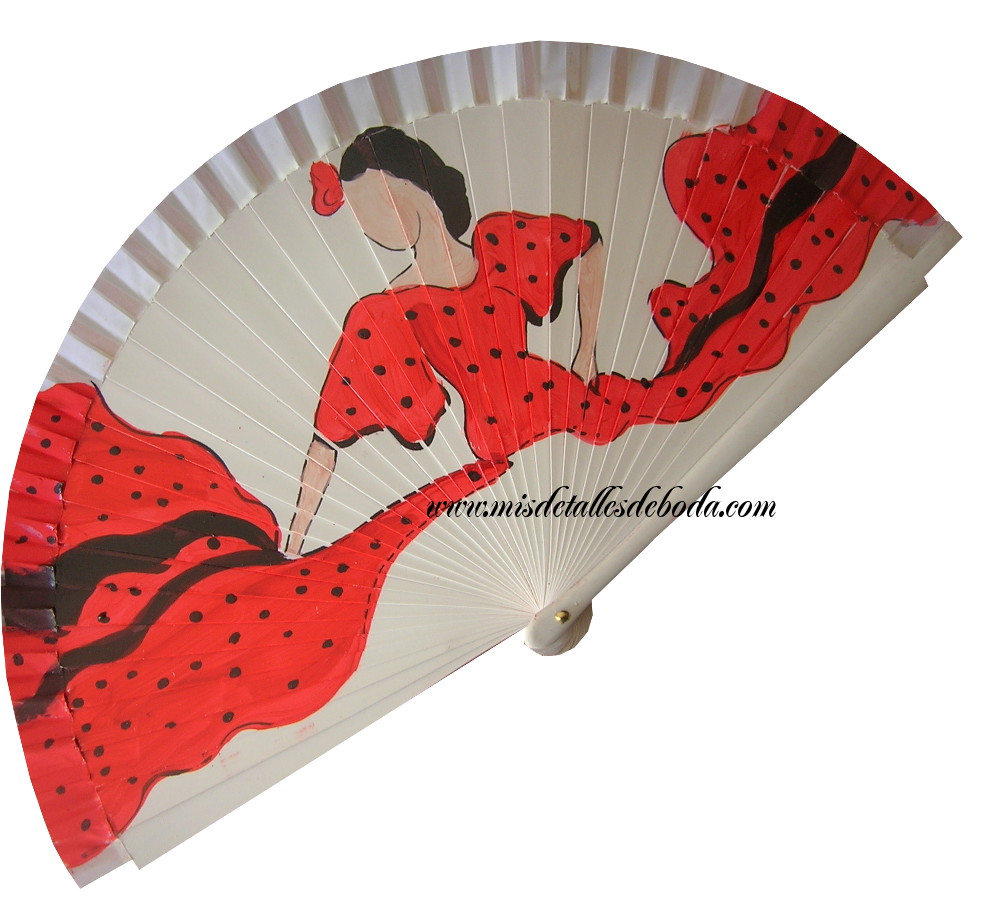 Bonito abanico blanco de madera y tela pintado a mano en con sevillanas bailando por los dos lados del abanico