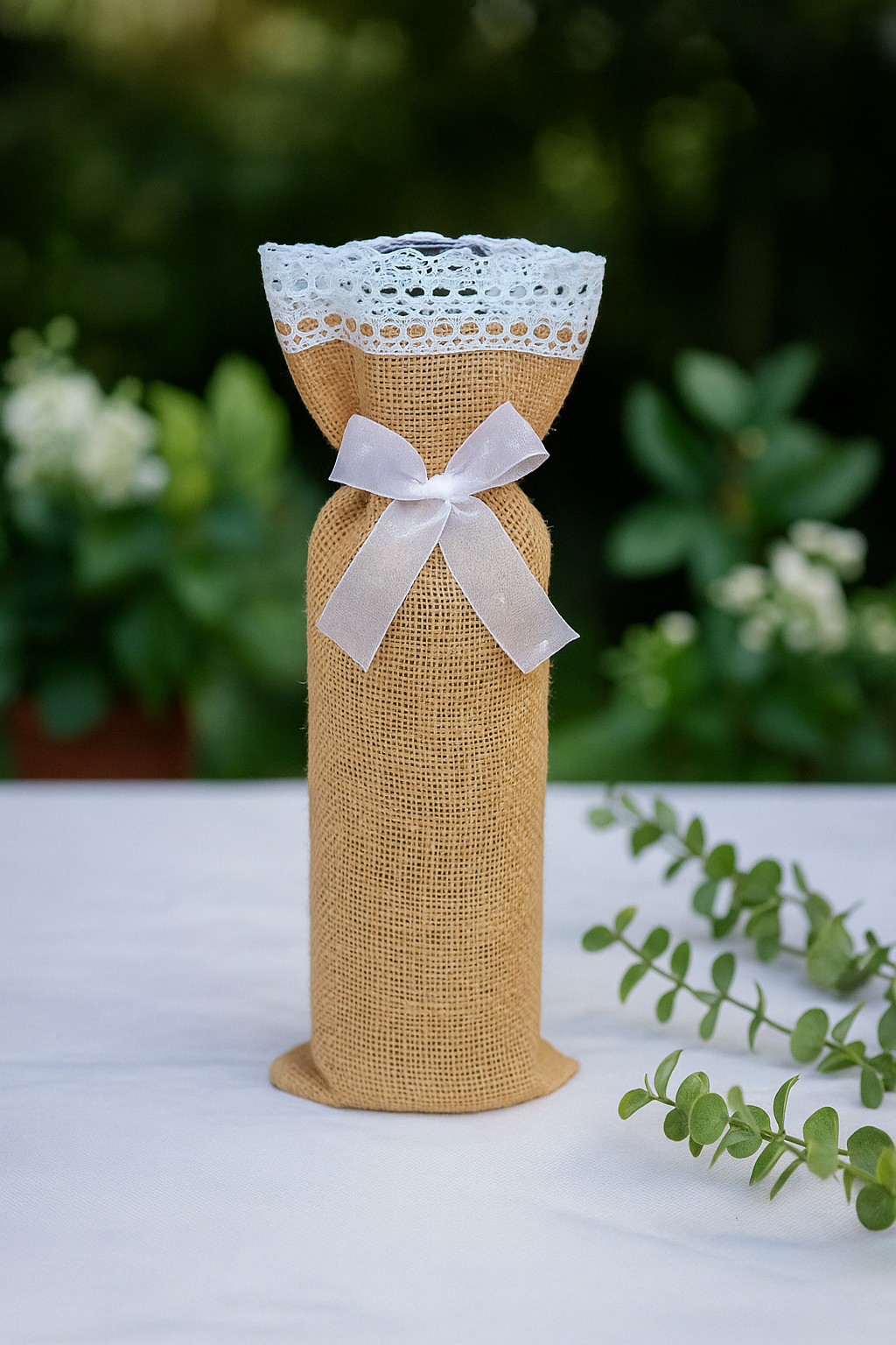Exclusivo saco rustico para botellas hecho de yute (arpillera) decorado con encaje de algodón blanco de bolitas