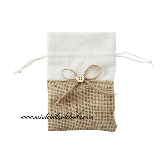 Esta bolsita combina los materiales de jute y tela color blanco roto.