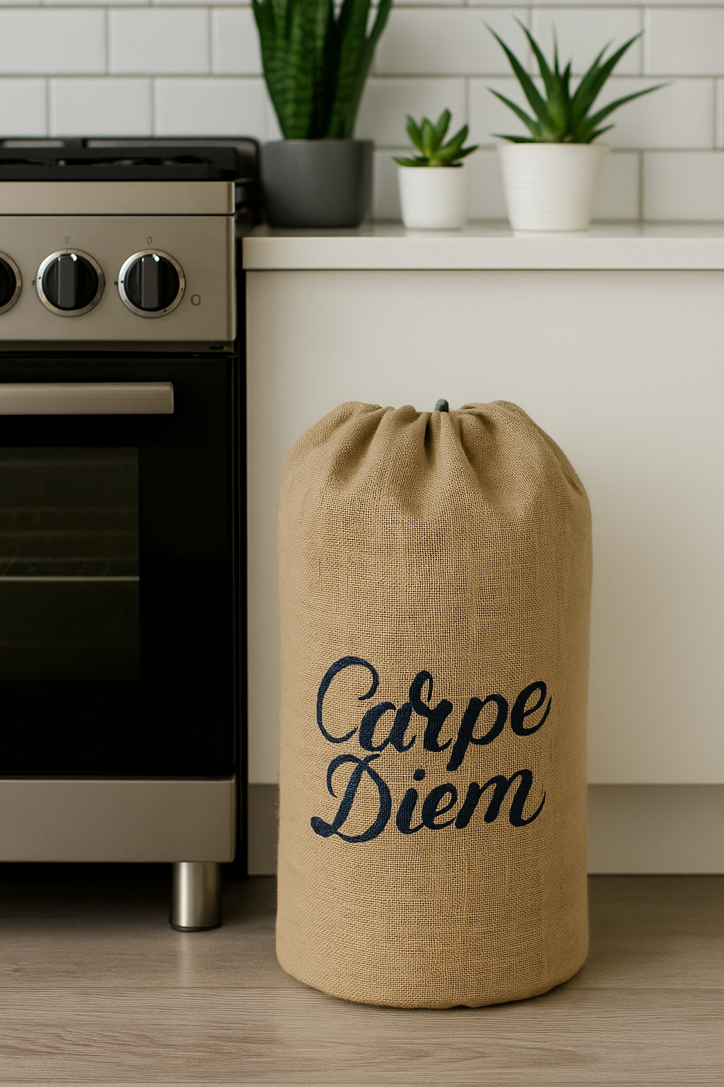 Hecha de tela de arpillera color natural con adorable pintura: Carpe Diem