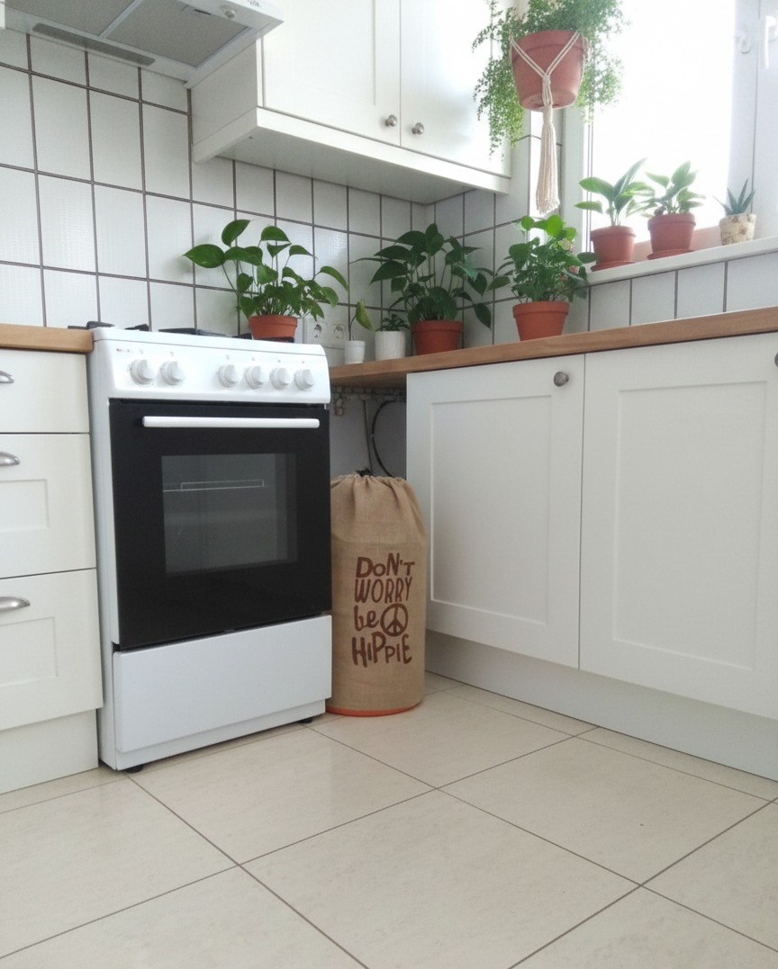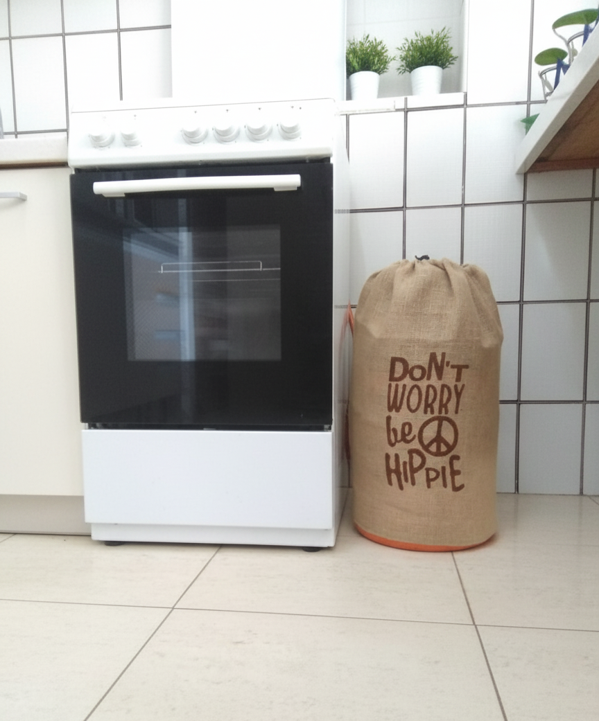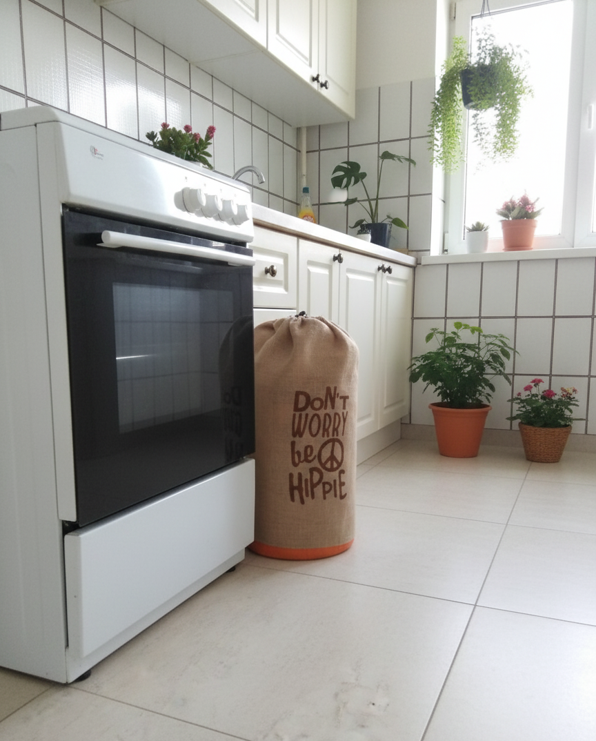 Hecha de tela de arpillera color natural con adorable pintura marrón: Don´t worry be hippie