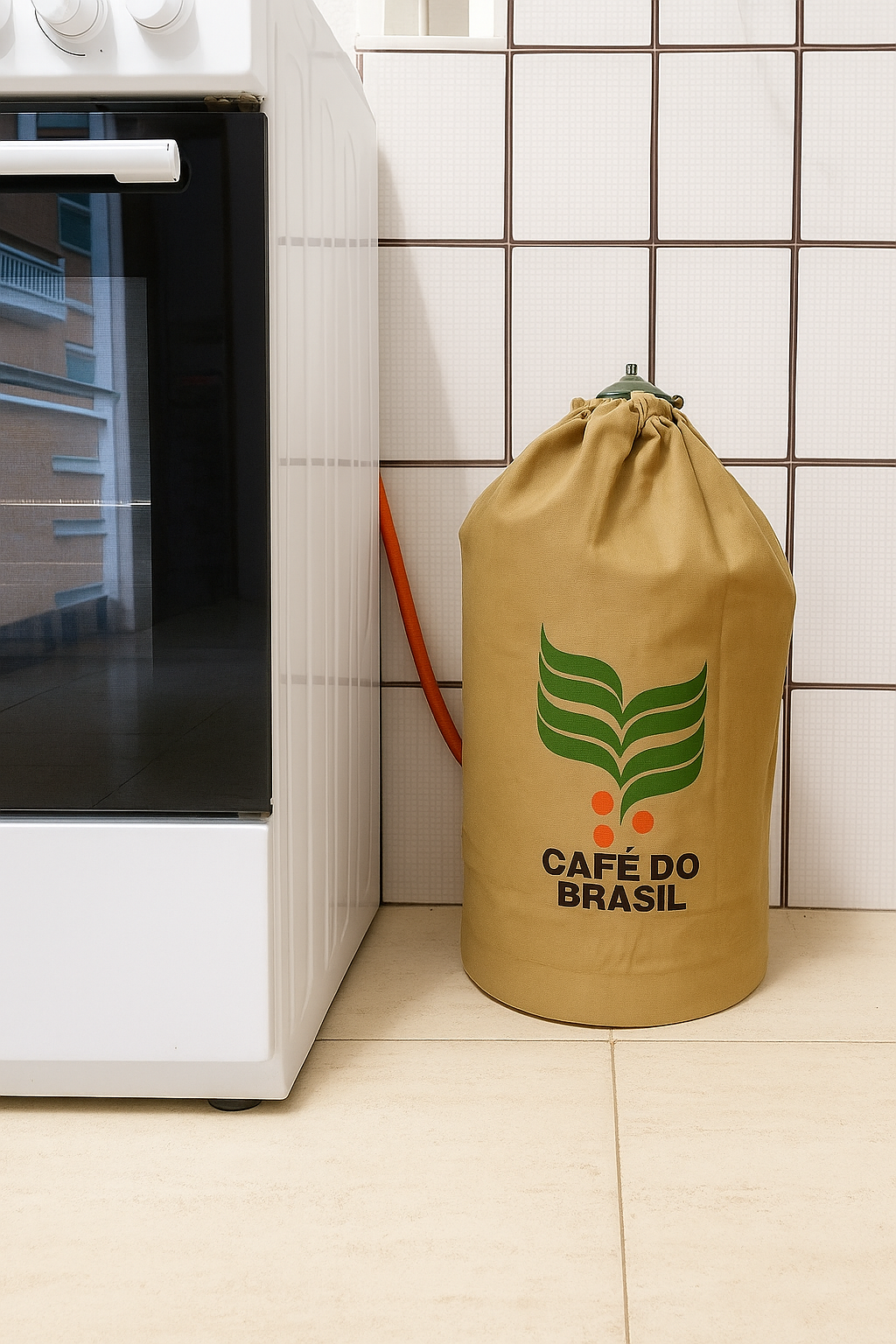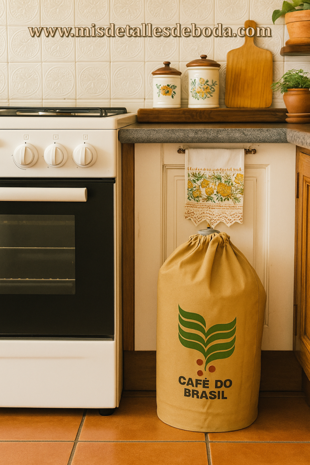Hecha de tela marrón y pintada a mano con adorable pintura Café do Brasil