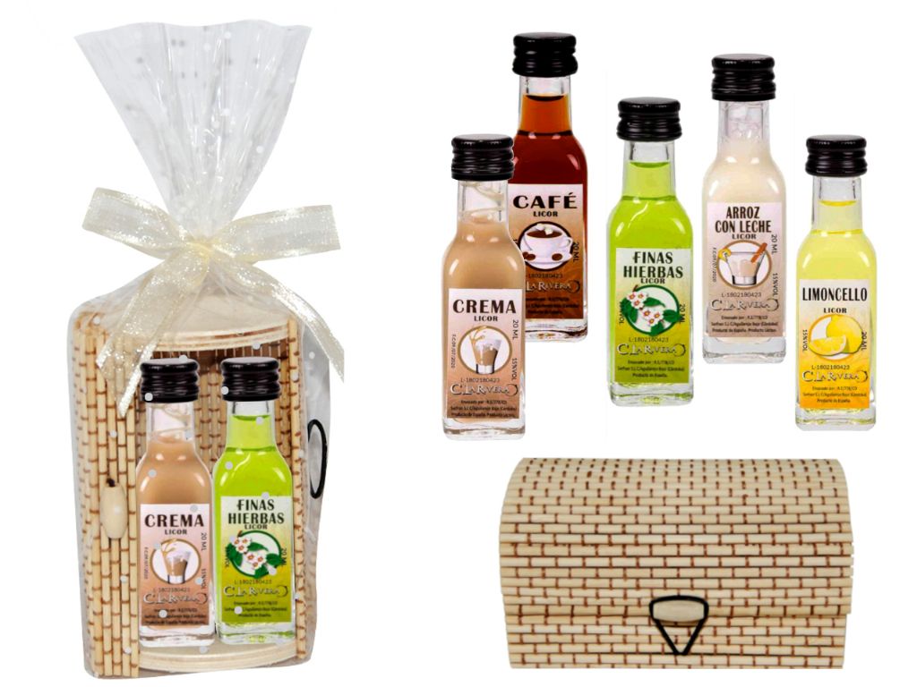 Preciosa cajita de mimbre + 2 mini botellita de licor + bolsa de celofán y cinta para detalle de boda, recuerdo de invitados