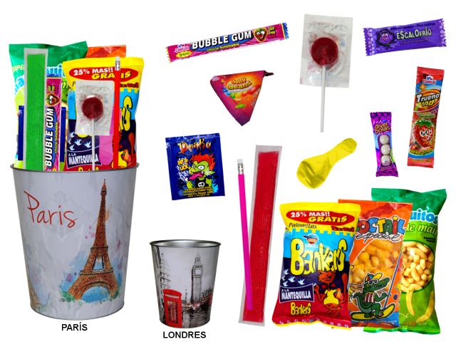 Papelera metalizada ciudades con golosinas, polo y lápiz