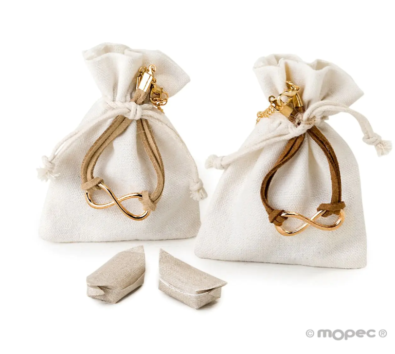 Muy combinable. Estas pulseras de ante marrón con el detalle del símbolo del infinito en dorado son muy adecuadas para regalar como detalle a los invitados por ejemplo en una boda. Sus bolsitas de algodón color marfil y lazada bicolor tan de tendencia contienen 2 riquísimos caramelos de sabor afrutado y con envoltorio muy original que hace que resalte todavía más este complemento.